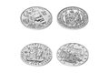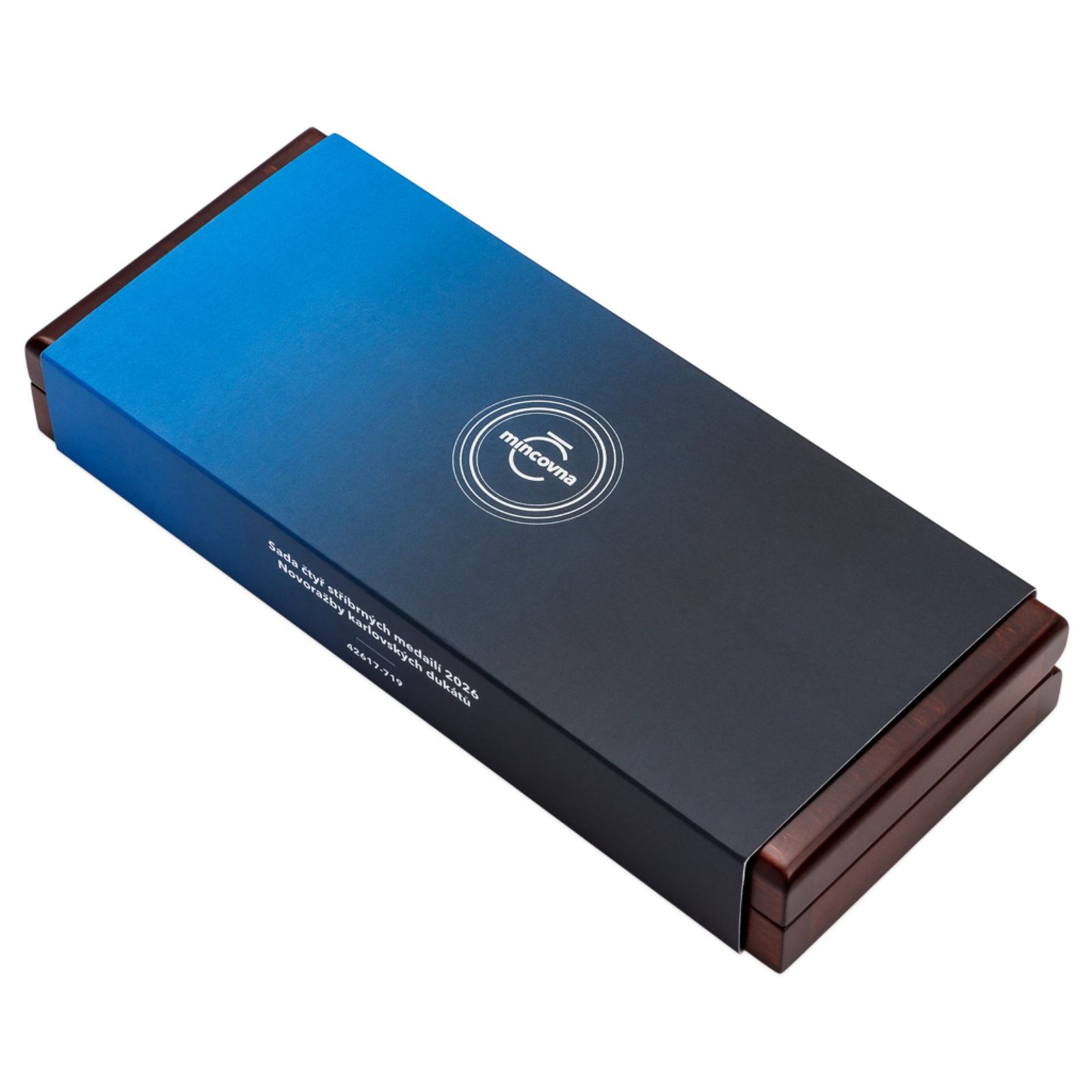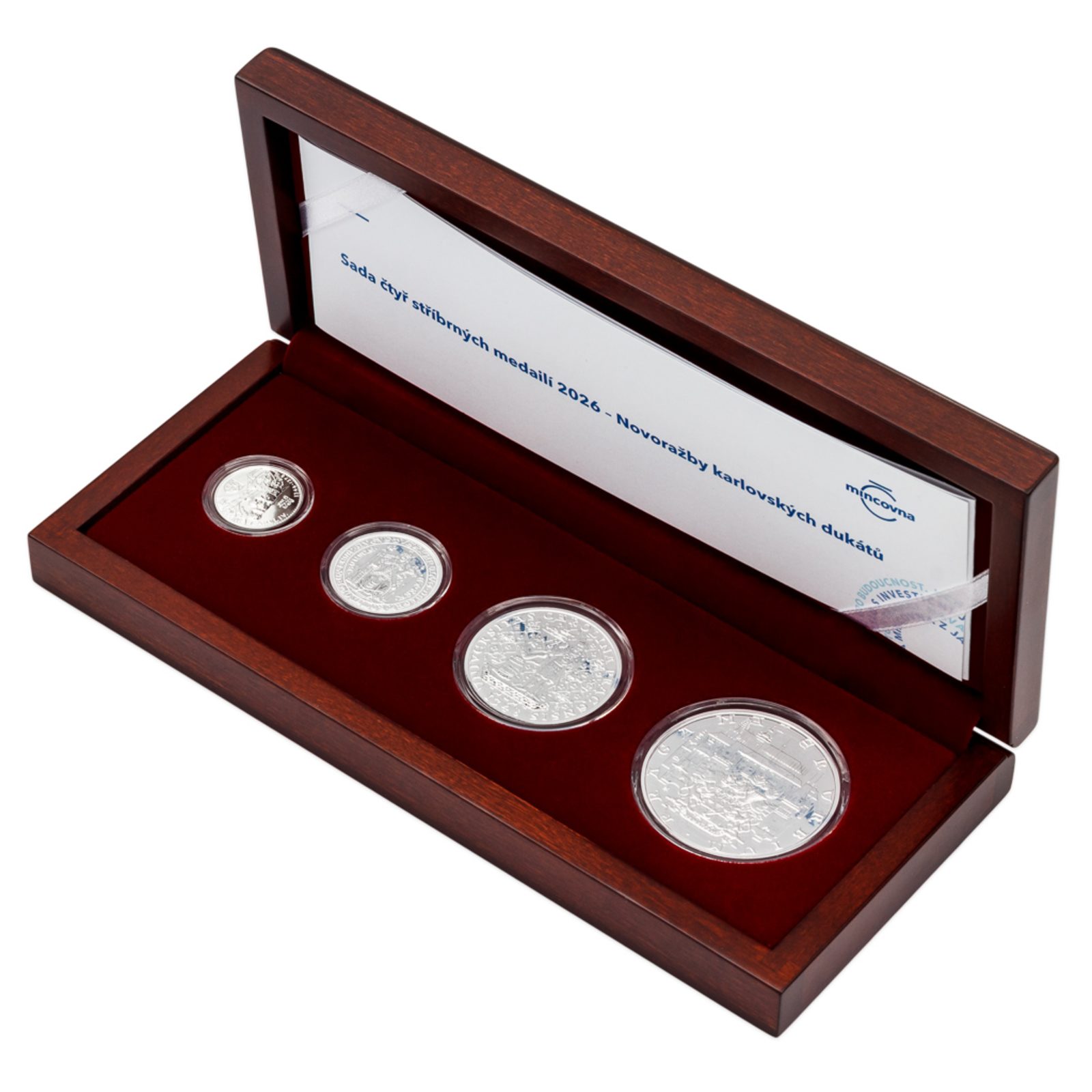 Čtyři stříbrné novoražby jsou uloženy do luxusní dřevěné etue. Emisní náklad čítá pouhých 80 ucelených sad.